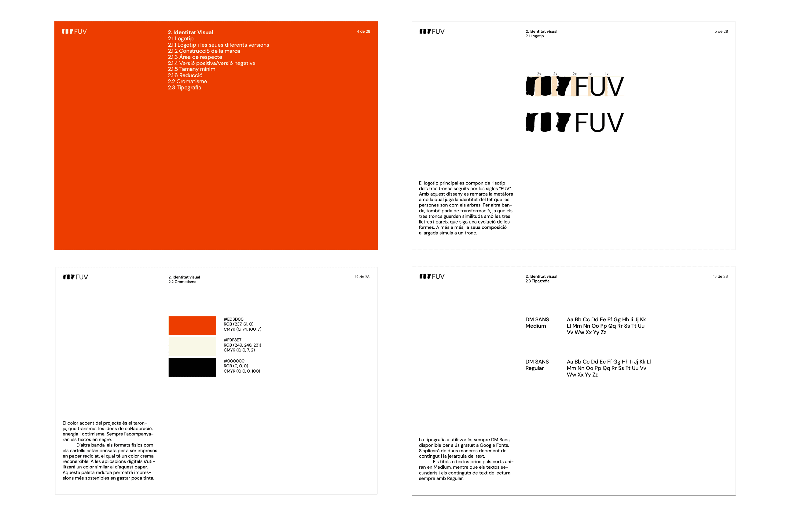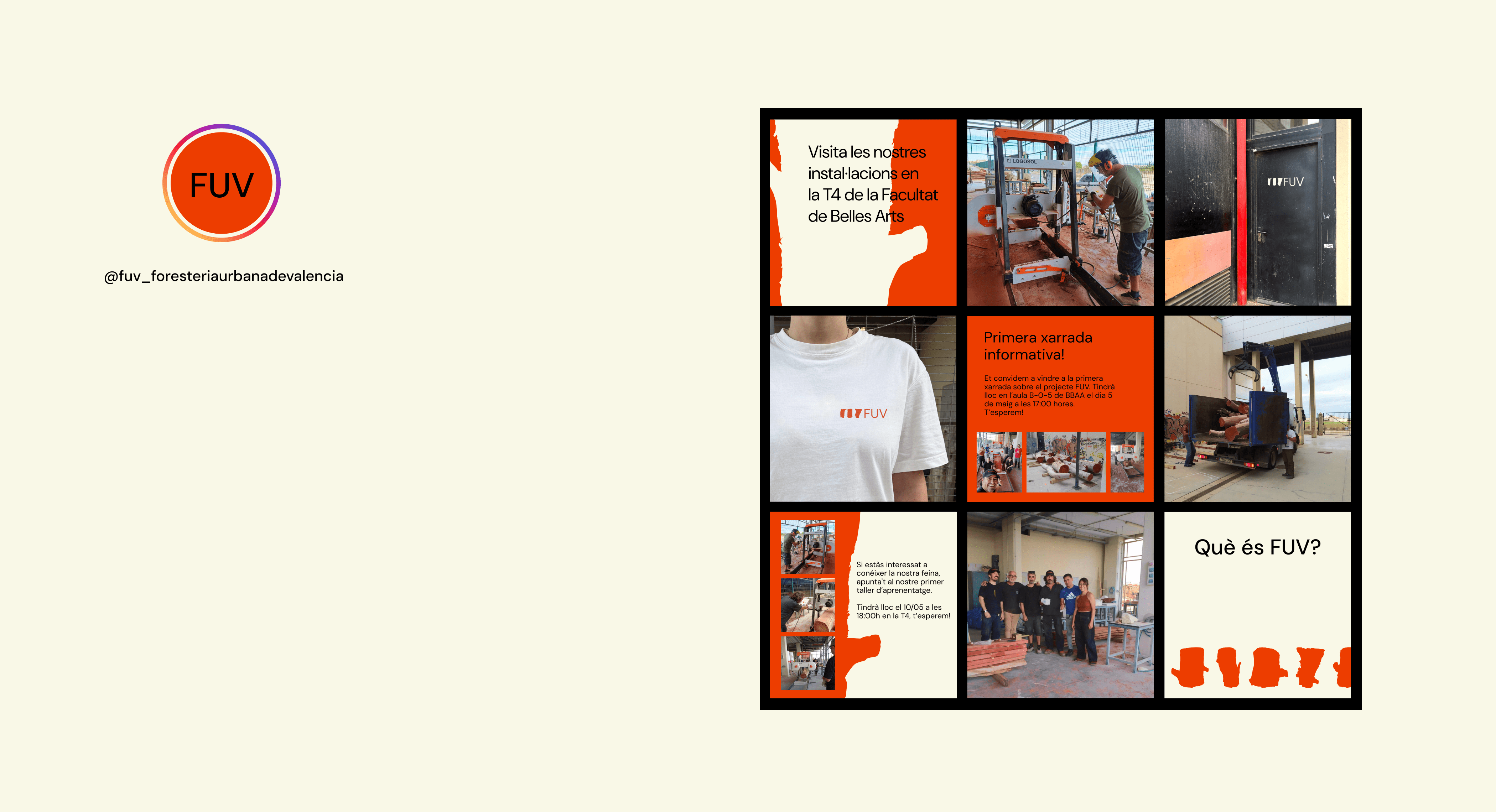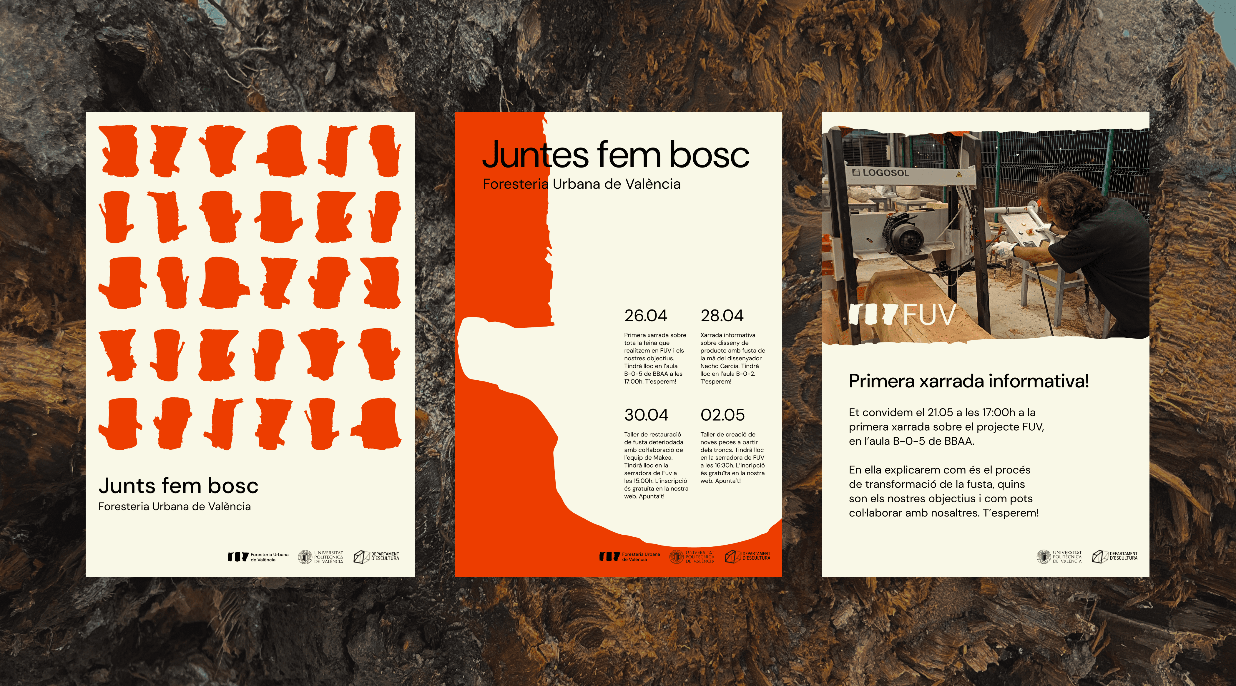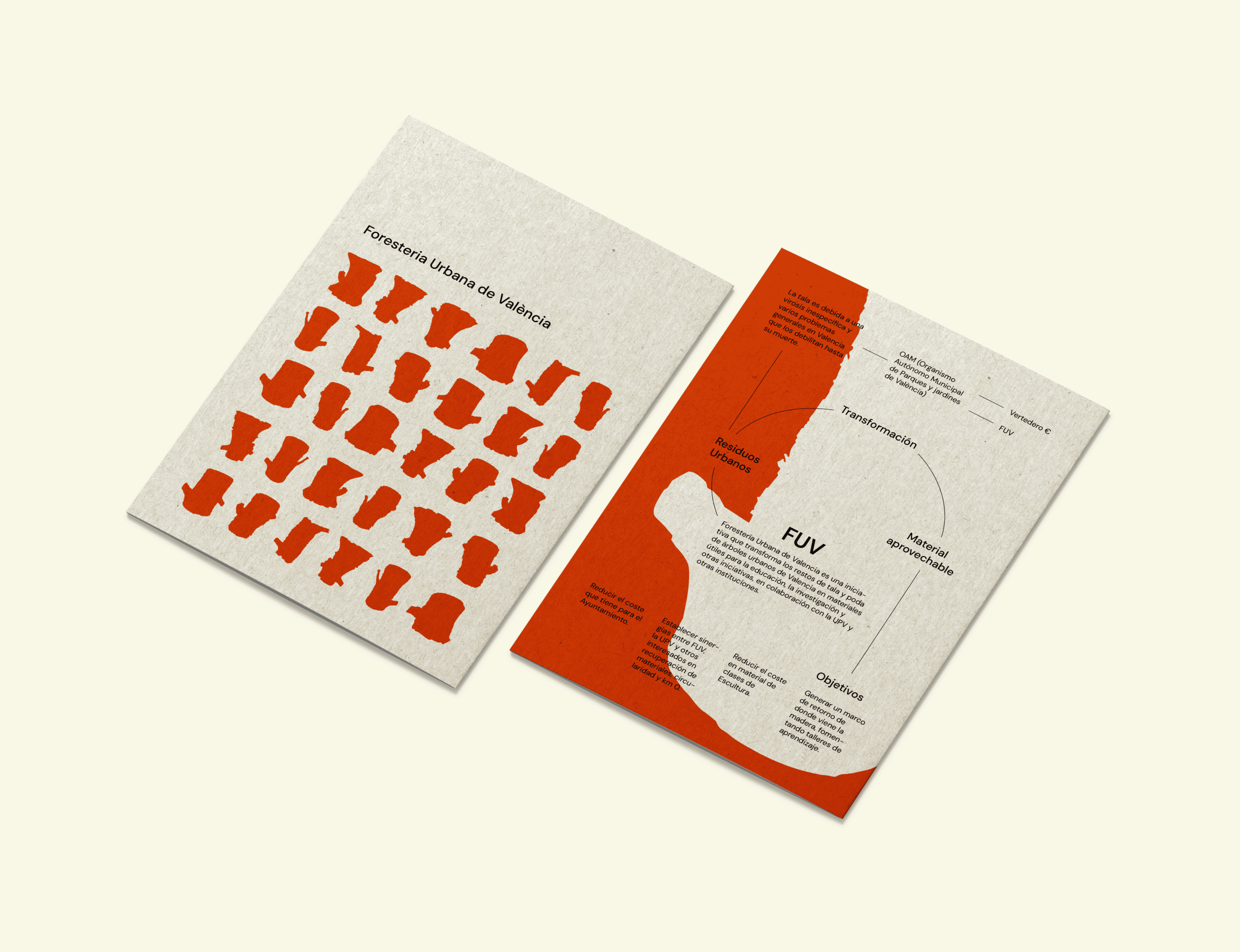 Creación de toda la identidad visual y gráfica de FUV (Foresteria Urbana de València), una iniciativa que transforma residuos urbanos (concretamente los restos de tala y poda del arbolado metropolitano de la ciudad de Valencia), en material aprovechable con destino a diversas iniciativas docentes, académicas y de investigación.
